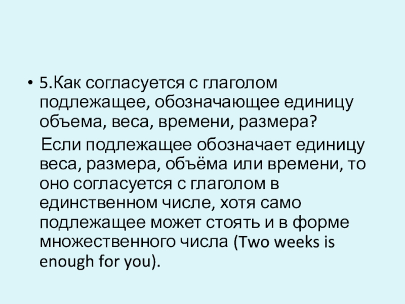 Слайд 65.Как согласуется с глаголом подлежащее, обозначающее единицу объема, веса, времени, размера?