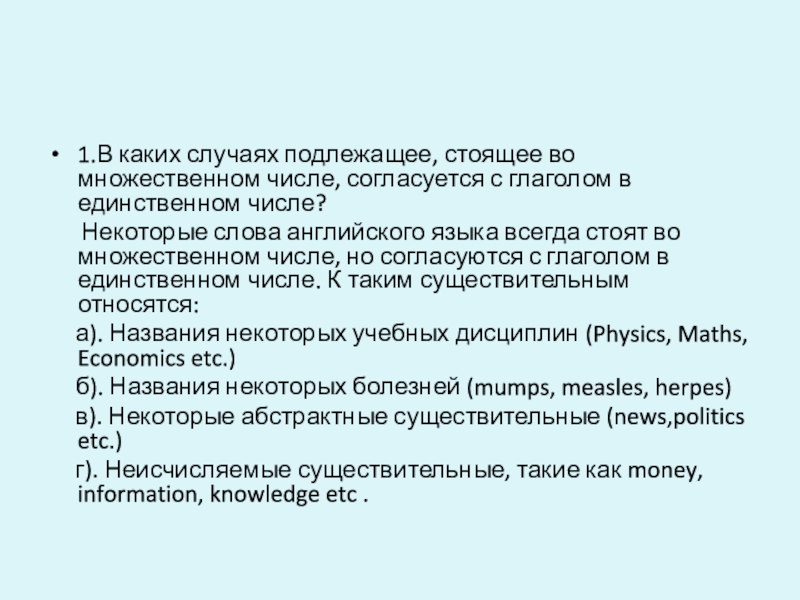 Некоторые слова английского языка всегда стоят во множественном числе, но согласуются с глаголом в единственном числе. К таким существительным относятся: