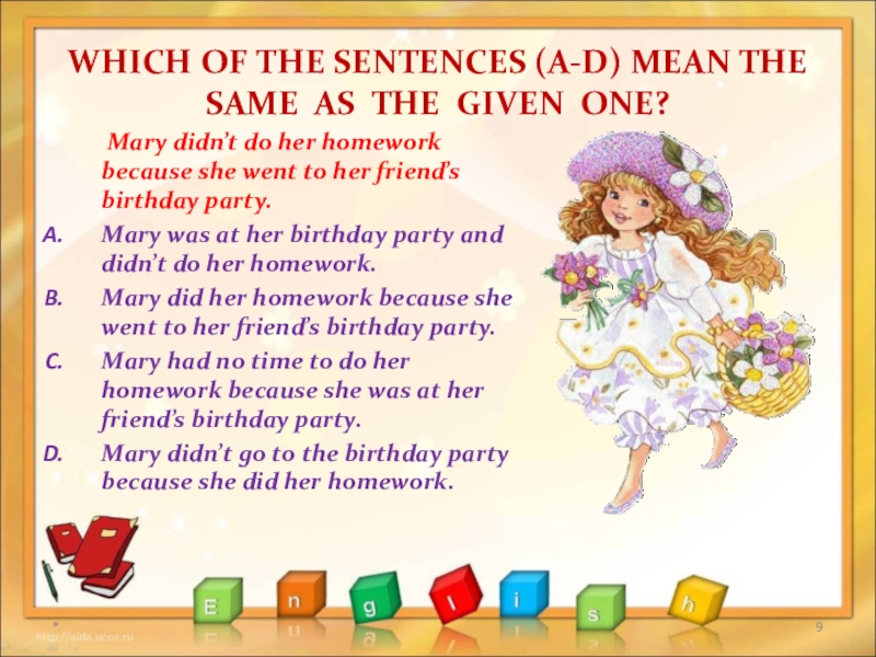 Mary didn’t do her homework because she went to her friend’s birthday party.