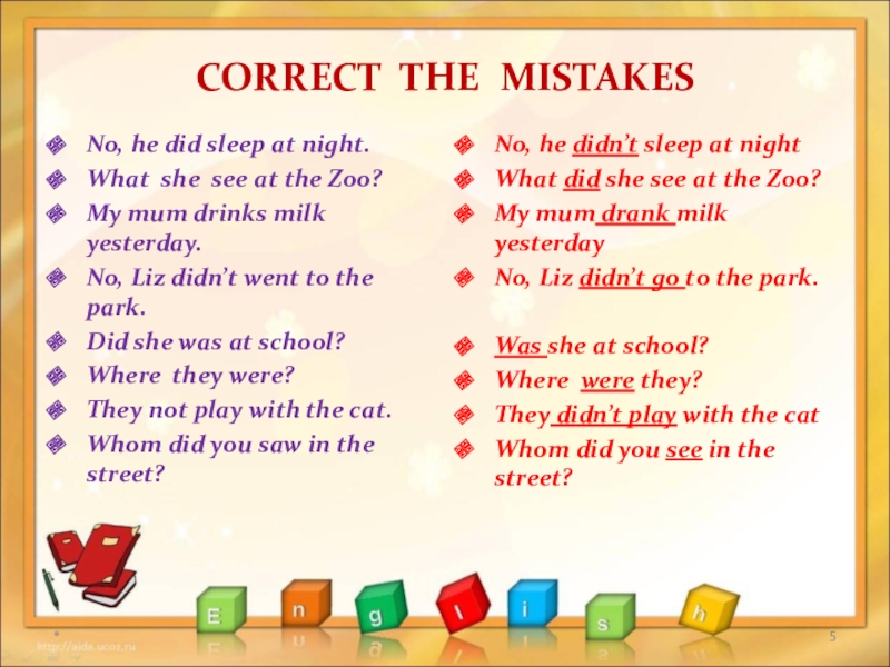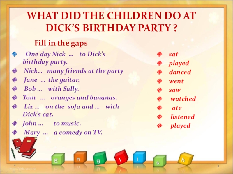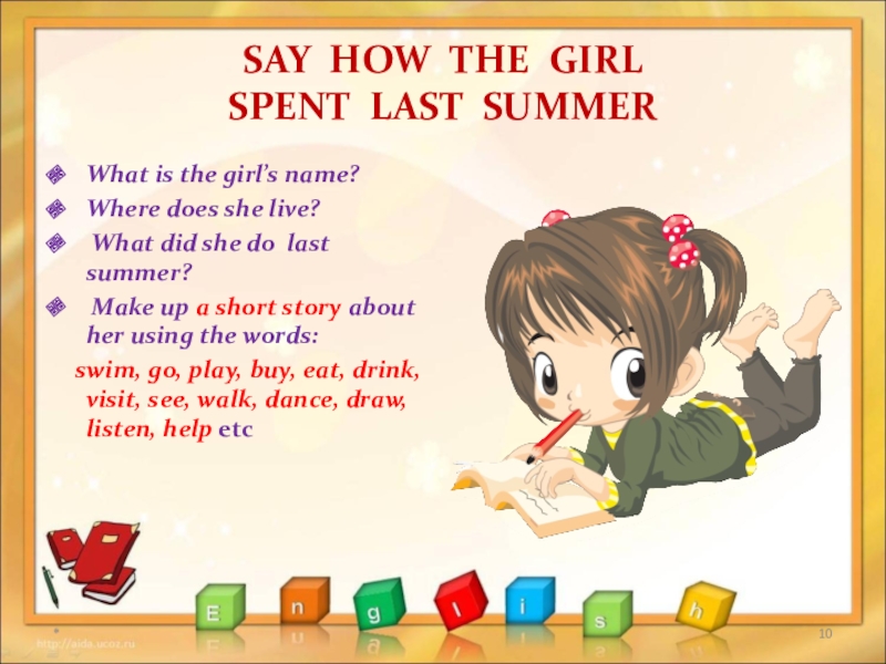 swim, go, play, buy, eat, drink, visit, see, walk, dance, draw, listen, help etc
