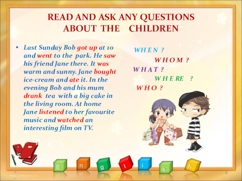 Last Sunday Bob got up at 10 and went to the park. He saw his friend Jane there. It was warm and sunny. Jane bought ice-cream and ate it. In the evening Bob and his mum drank tea with a big cake in the living room. At home Jane listened to her favourite music and watched an interesting film on TV.