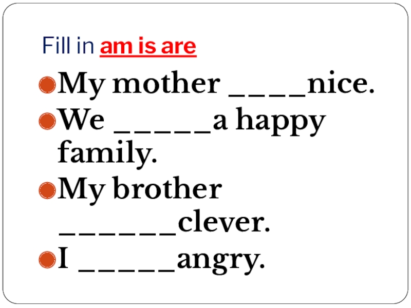 Fill in am is areMy mother ____nice.We _____a happy family.My brother ______clever.I _____angry.