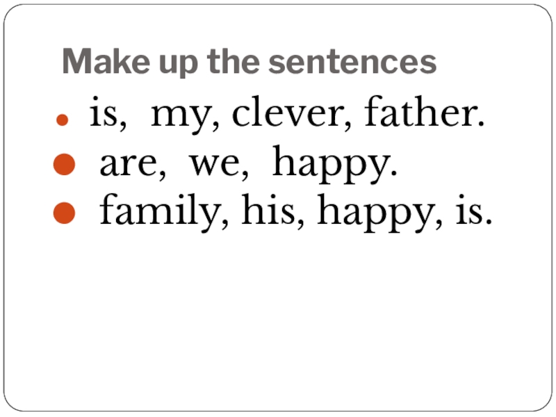 Make up the sentences is, my, clever, father. are, we, happy. family, his, happy, is.
