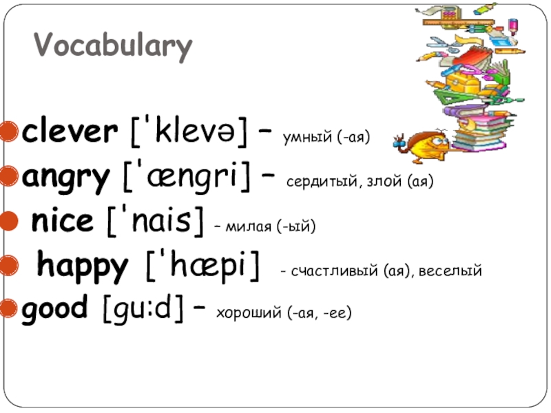 Vocabularyclever ['klevə] – умный (-ая)angry ['ængri] – сердитый, злой (ая) nice ['nais] – милая (-ый) happy ['hæpi]