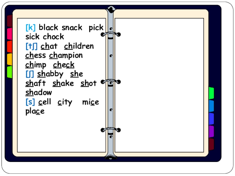 [k] black snack pick sick chock[tʃ] chat children chess champion chimp check[ʃ] shabby she shaft shake shot shadow [s] cell city mice place