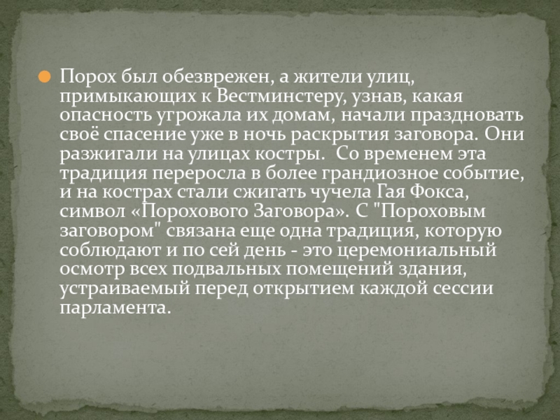 Слайд 10Порох был обезврежен, а жители улиц, примыкающих к Вестминстеру, узнав, какая
