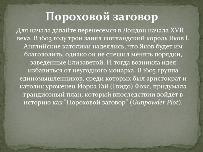 году трон занял шотландский король Яков I. Английские католики надеялись, что Яков будет им благоволить, однако он не спешил менять порядки, заведённые Елизаветой. И тогда возникла идея избавиться от неугодного монарха. В 1605 группа единомышленников, среди которых был аристократ и католик уроженец Йорка Гай (Гвидо) Фокс, придумала грандиозный план, который впоследствии войдёт в историю как "Пороховой заговор" (Gunpowder Plot).