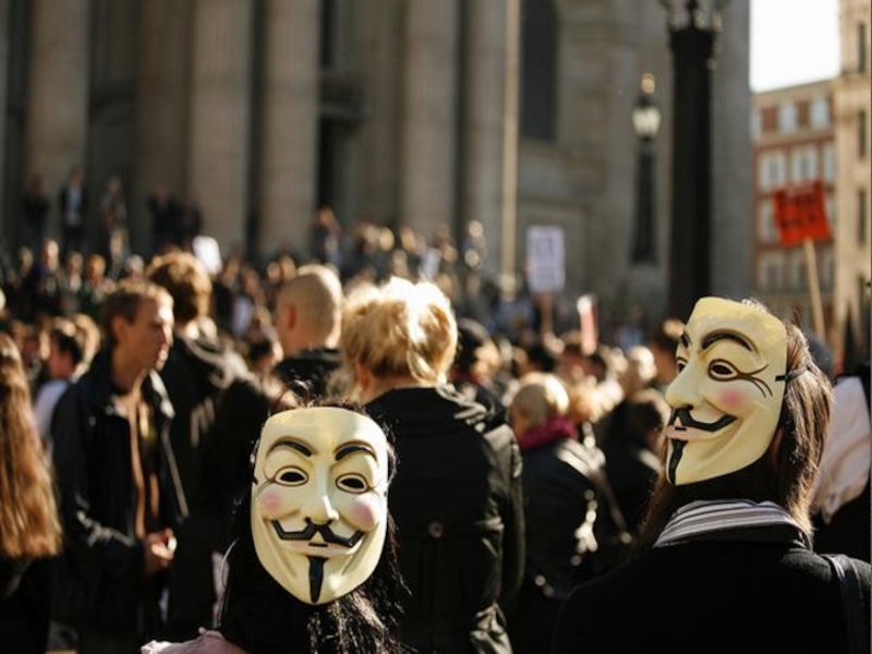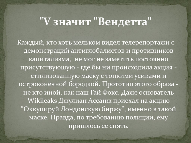 капитализма, не мог не заметить постоянно присутствующую - где бы ни происходила акция - стилизованную маску с тонкими усиками и остроконечной бородкой. Прототип этого образа - не кто иной, как наш Гай Фокс. Даже основатель Wikileaks Джулиан Ассанж приехал на акцию "Оккупируй Лондонскую биржу", именно в такой маске. Правда, по требованию полиции, ему пришлось ее снять.