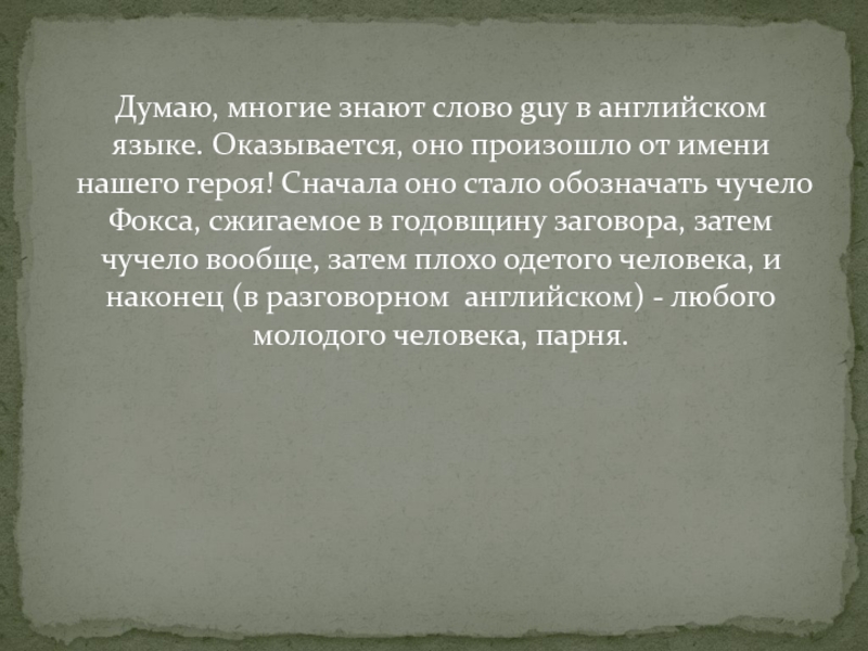 от имени нашего героя! Сначала оно стало обозначать чучело Фокса, сжигаемое в годовщину заговора, затем чучело вообще, затем плохо одетого человека, и наконец (в разговорном английском) - любого молодого человека, парня.
