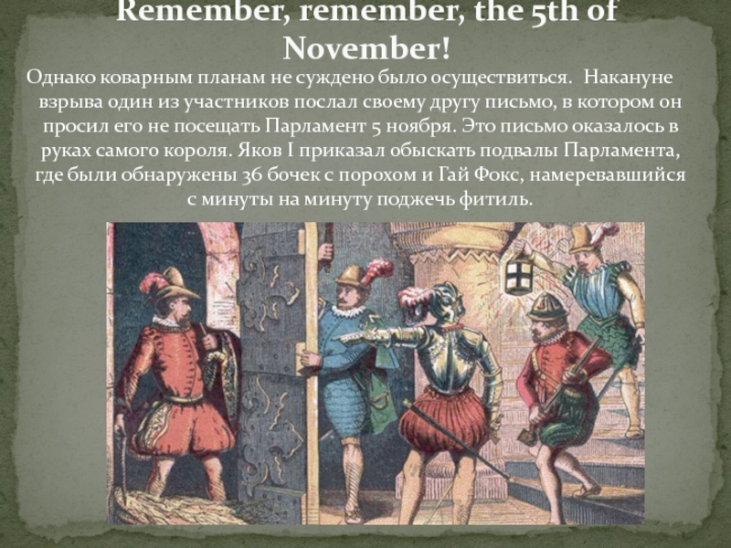 участников послал своему другу письмо, в котором он просил его не посещать Парламент 5 ноября. Это письмо оказалось в руках самого короля. Яков I приказал обыскать подвалы Парламента, где были обнаружены 36 бочек с порохом и Гай Фокс, намеревавшийся с минуты на минуту поджечь фитиль.