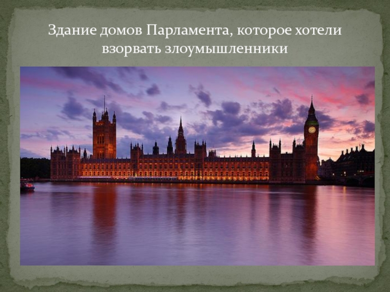 Слайд 8Здание домов Парламента, которое хотели взорвать злоумышленники