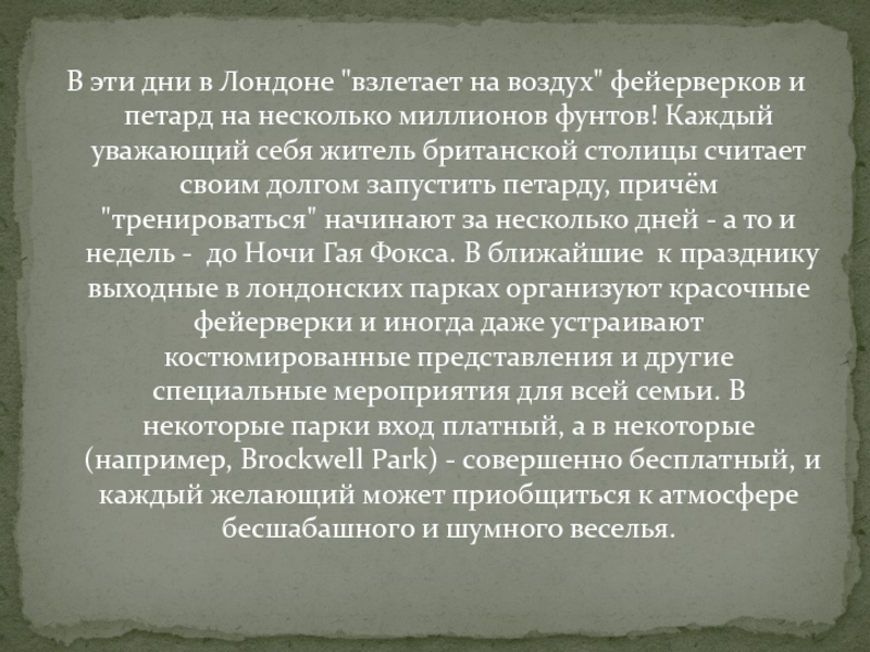 на несколько миллионов фунтов! Каждый уважающий себя житель британской столицы считает своим долгом запустить петарду, причём "тренироваться" начинают за несколько дней - а то и недель - до Ночи Гая Фокса. В ближайшие к празднику выходные в лондонских парках организуют красочные фейерверки и иногда даже устраивают костюмированные представления и другие специальные мероприятия для всей семьи. В некоторые парки вход платный, а в некоторые (например, Brockwell Park) - совершенно бесплатный, и каждый желающий может приобщиться к атмосфере бесшабашного и шумного веселья.