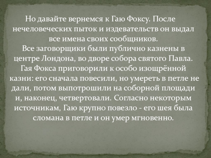 Слайд 12Но давайте вернемся к Гаю Фоксу. После нечеловеческих пыток и издевательств