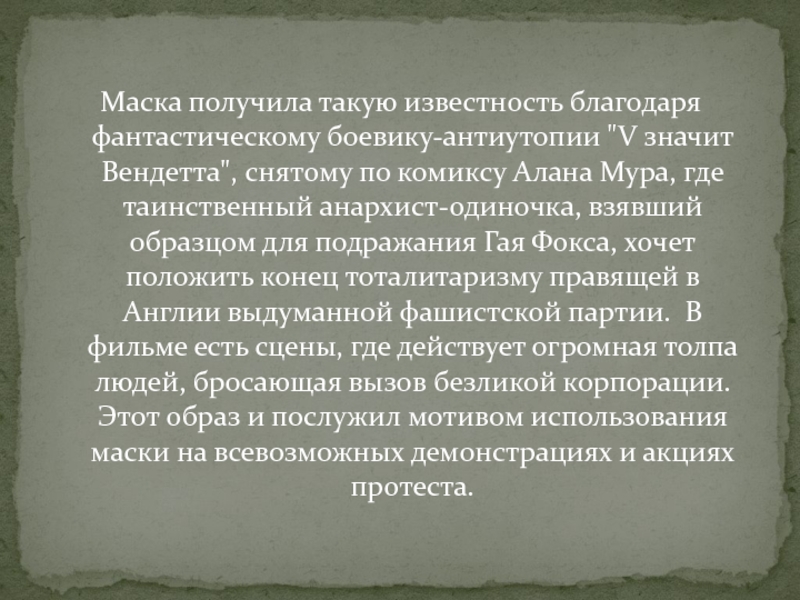 Слайд 24Маска получила такую известность благодаря фантастическому боевику-антиутопии "V значит Вендетта", снятому