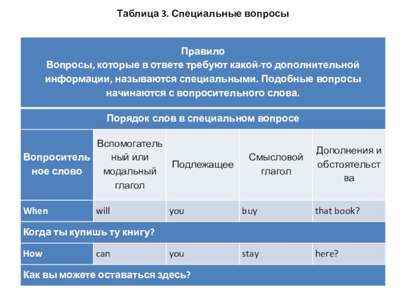 Слайд 5Таблица 3. Специальные вопросы