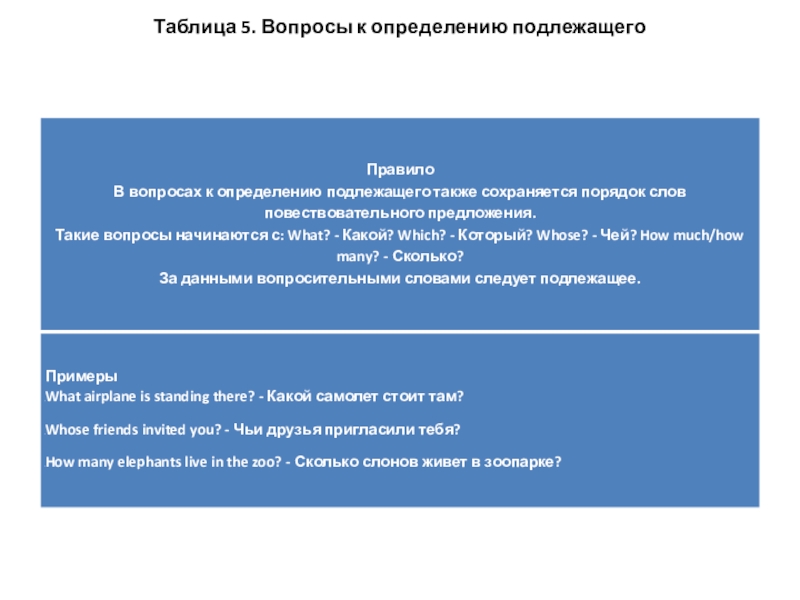 Слайд 7Таблица 5. Вопросы к определению подлежащего