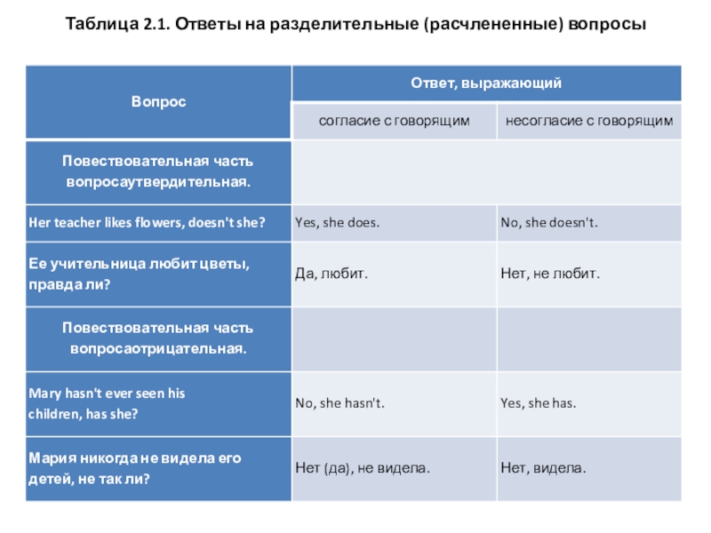 Слайд 4Таблица 2.1. Ответы на разделительные (расчлененные) вопросы