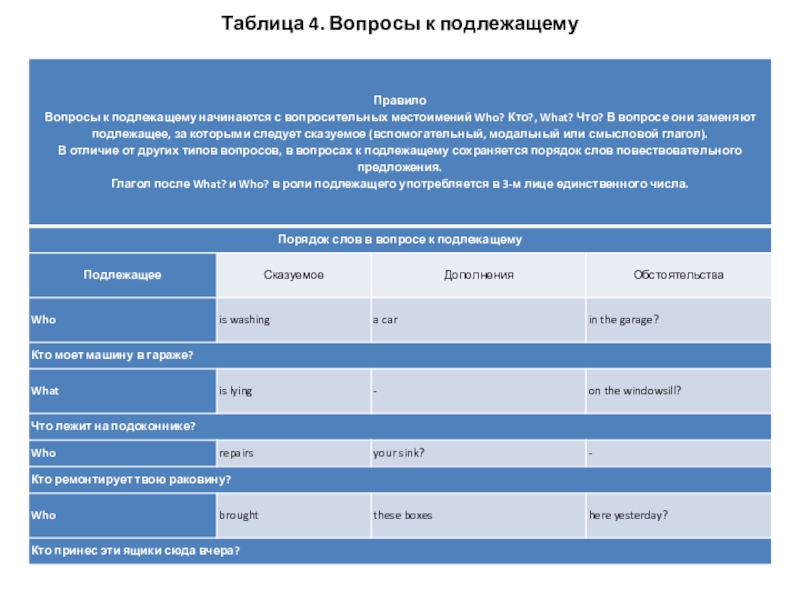 Слайд 6Таблица 4. Вопросы к подлежащему