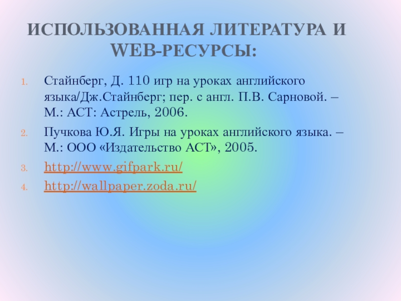 ИСПОЛЬЗОВАННАЯ ЛИТЕРАТУРА И WEB-РЕСУРСЫ:Стайнберг, Д. 110 игр на уроках английского языка/Дж.Стайнберг; пер. с англ. П.В. Сарновой. –