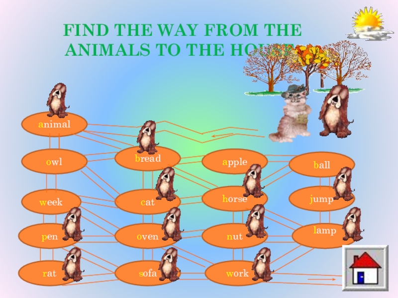 FIND THE WAY FROM THE ANIMALS TO THE HOUSE. animalowlweekpenratbreadcatovensofaapplehorsenutworkballjumplamp