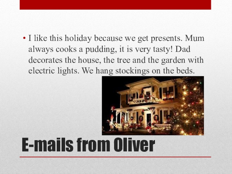 E-mails from OliverI like this holiday because we get presents. Mum always cooks a pudding, it is