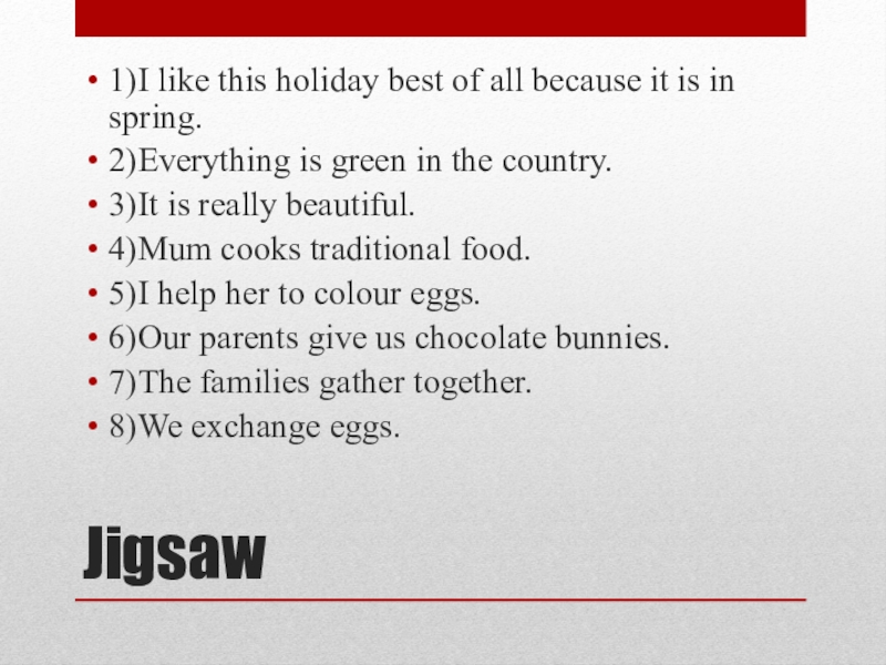 Jigsaw1)I like this holiday best of all because it is in spring. 2)Everything is green in the