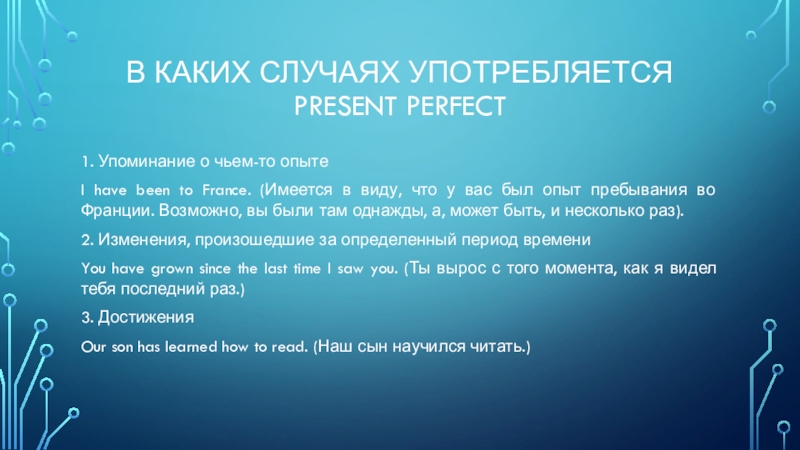 В каких случаях употребляется present perfect1. Упоминание о чьем-то опытеI have been to France. (Имеется в виду,