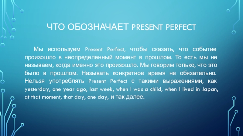 произошло в неопределенный момент в прошлом. То есть мы не называем, когда именно это произошло. Мы говорим только, что это было в прошлом. Называть конкретное время не обязательно. Нельзя употреблять Present Perfect с такими выражениями, как yesterday, one year ago, last week, when I was a child, when I lived in Japan, at that moment, that day, one day, и так далее.