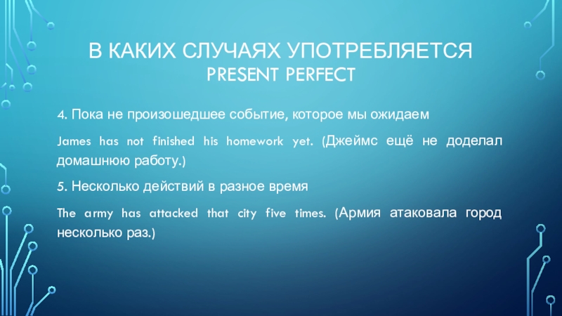 В каких случаях употребляется present perfect4. Пока не произошедшее событие, которое мы ожидаемJames has not finished his