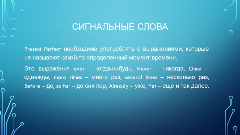 Сигнальные словаPresent Perfect необходимо употреблять с выражениями, которые не называют какой-то определенный момент времени.Это выражения ever –