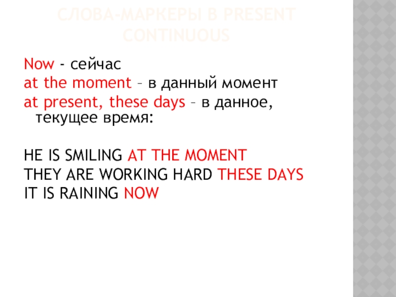 Слова-маркеры в present continuous Now - сейчасat the moment – в данный моментat present, these days –