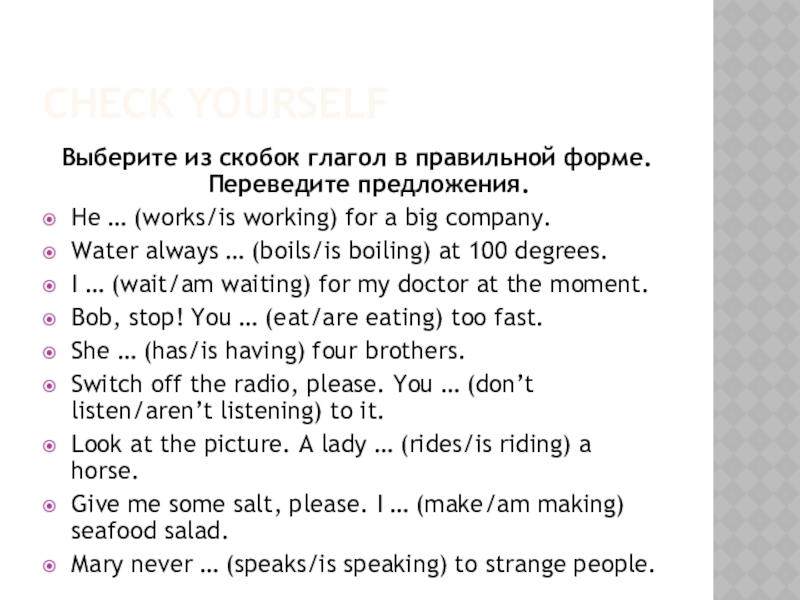 check yourselfВыберите из скобок глагол в правильной форме. Переведите предложения.He … (works/is working) for a big company.Water