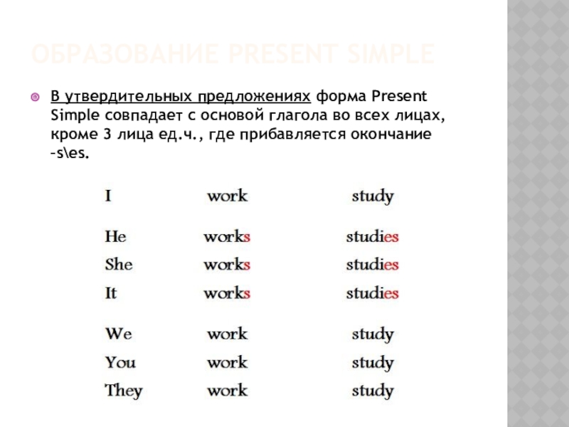 Образование present simpleВ утвердительных предложениях форма Present Simple совпадает с основой глагола во всех лицах, кроме 3 лица ед.ч., где