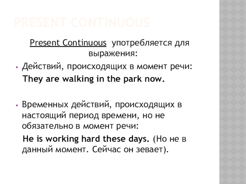 Present ContinuousPresent Continuous  употребляется для выражения: Действий, происходящих в момент речи:  They are walking in the park