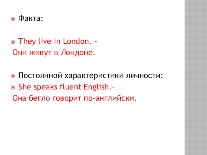 Факта:They live in London. -Они живут в Лондоне. Постоянной характеристики личности:She speaks fluent English.-Она бегло говорит по-английски.