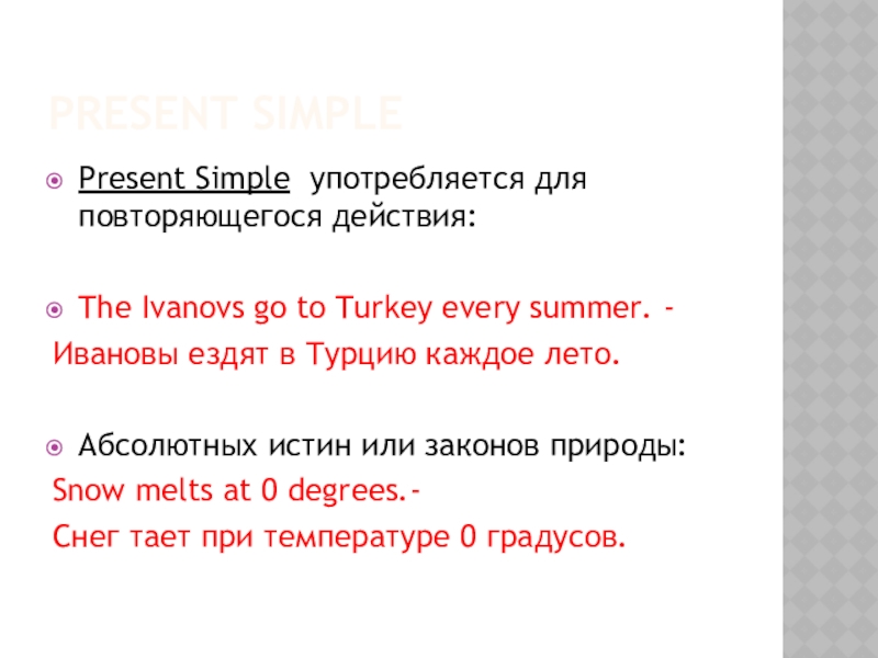 Present simplePresent Simple  употребляется для повторяющегося действия:The Ivanovs go to Turkey every summer. -Ивановы ездят в Турцию каждое лето. Абсолютных истин или законов природы:Snow melts at 0 degrees.-Снег тает при температуре 0 градусов.