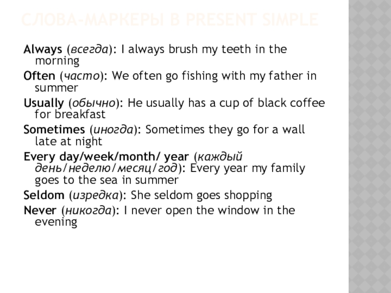 Слова-маркеры в present simple Always (всегда): I always brush my teeth in the morning Often (часто): We