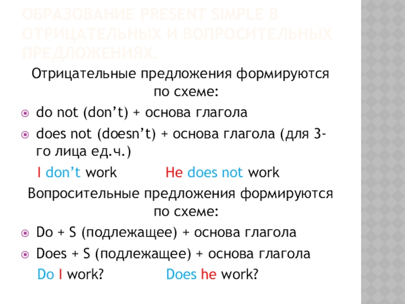 Образование present simple в отрицательных и вопросительных предложениях.Отрицательные предложения формируются по схеме:do not (don’t) + основа глаголаdoes