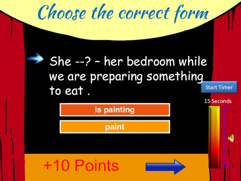 Choose the correct form15 Seconds150Try AgainGreat Job!paintis painting+10 PointsShe --? – her bedroom while we are preparing