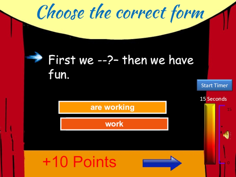 Choose the correct form15 Seconds150Try AgainGreat Job!are workingwork+10 PointsFirst we --?– then we have fun.