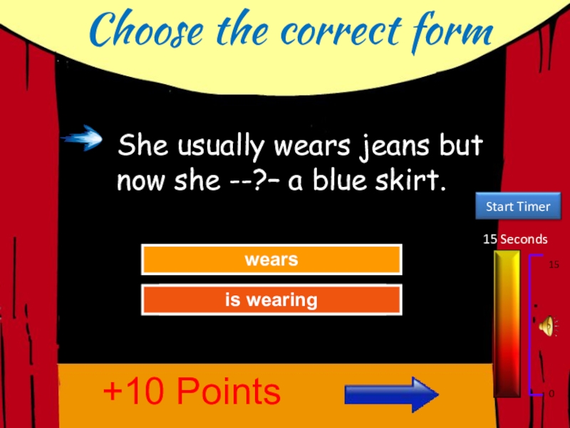 Choose the correct form15 Seconds150Try AgainGreat Job!wearsis wearing+10 PointsShe usually wears jeans but now she --?– a