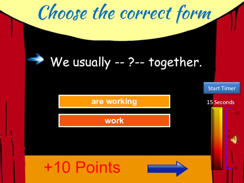 Choose the correct form15 Seconds150Try AgainGreat Job!are workingwork+10 PointsWe usually -- ?-- together.