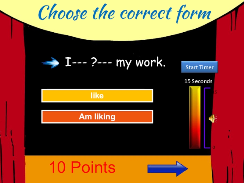 Choose the correct form15 Seconds150Try AgainGreat Job!Am likinglike10 PointsI--- ?--- my work.