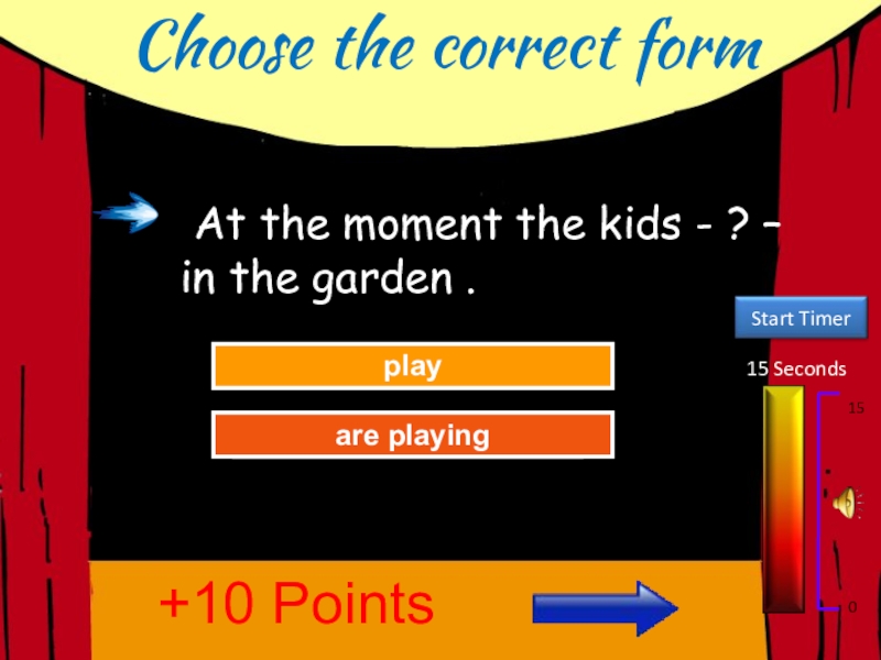 Choose the correct form15 Seconds150Try AgainGreat Job!playare playing+10 Points At the moment the kids - ? –