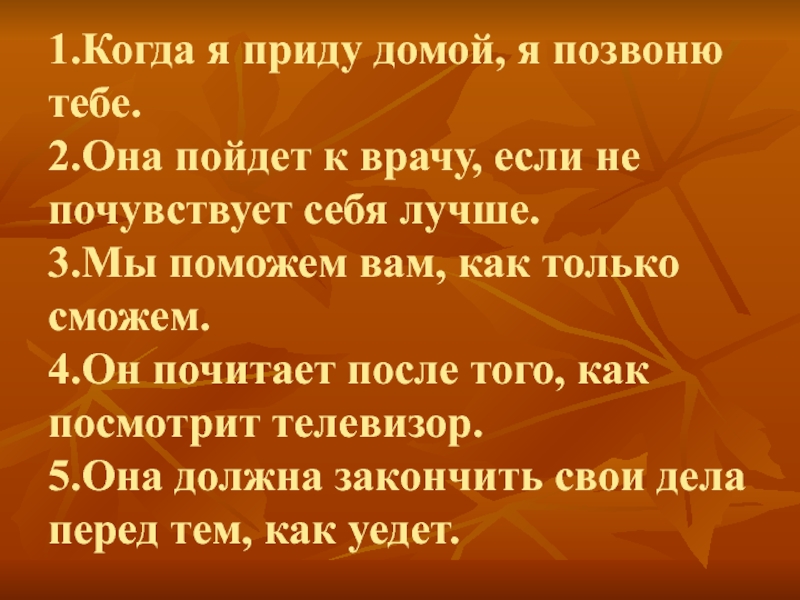 Слайд 6 1.Когда я приду домой, я позвоню тебе. 2.Она пойдет к врачу, если