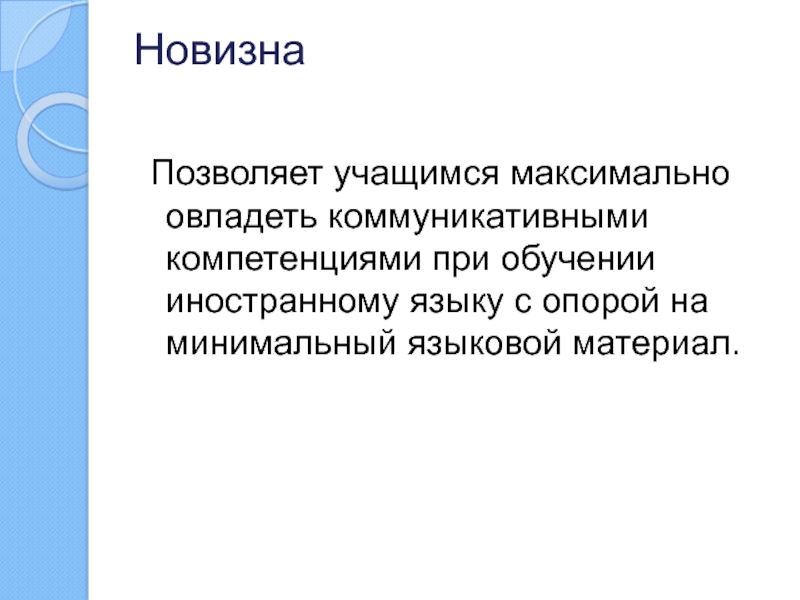 Новизна  Позволяет учащимся максимально овладеть коммуникативными компетенциями при обучении иностранному языку с опорой на минимальный языковой