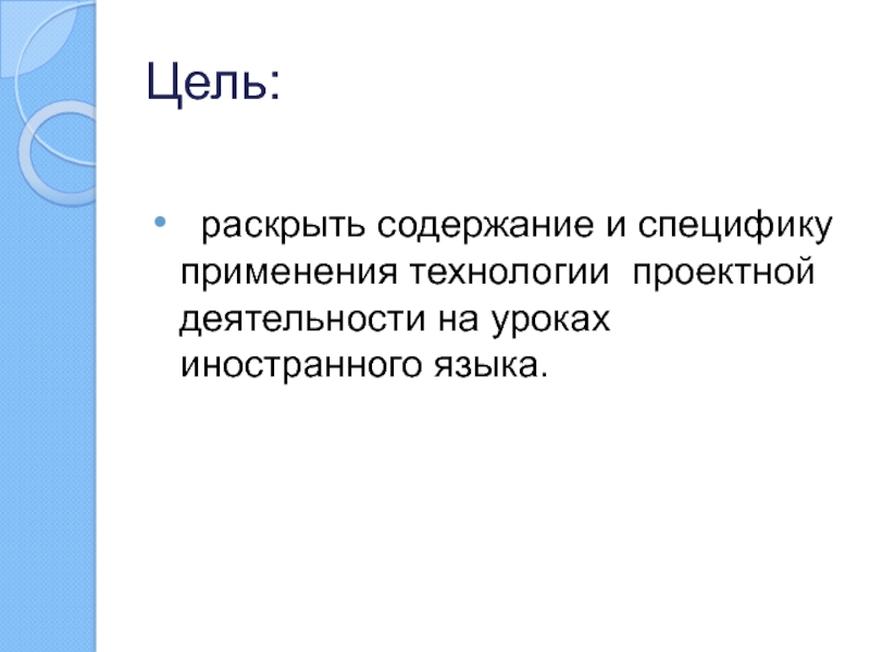 Цель:•  раскрыть содержание и специфику   применения технологии проектной деятельности на уроках иностранного языка.