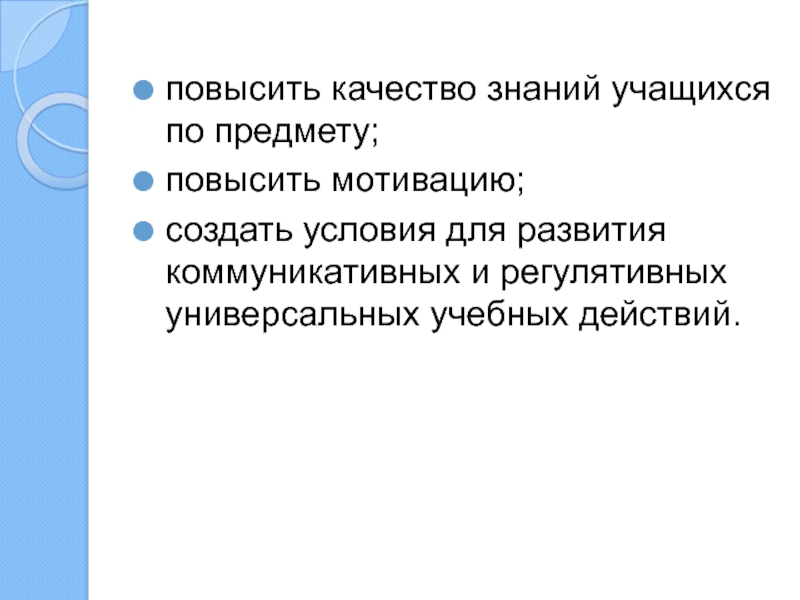 повысить качество знаний учащихся по предмету;повысить мотивацию;создать условия для развития коммуникативных и регулятивных универсальных учебных действий.