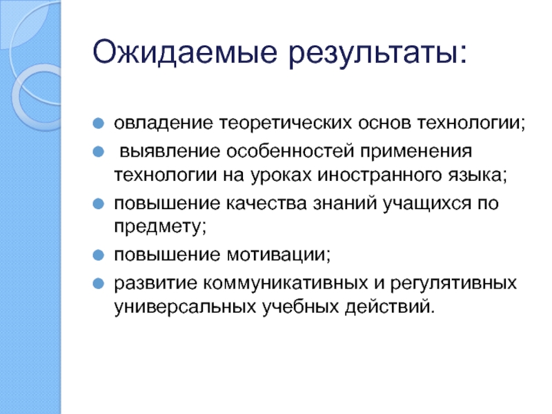 Ожидаемые результаты:овладение теоретических основ технологии; выявление особенностей применения технологии на уроках иностранного языка;повышение качества знаний учащихся по