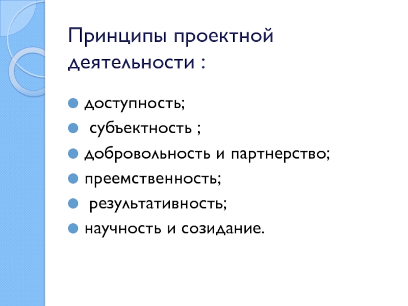 Принципы проектной деятельности : доступность; субъектность ;добровольность и партнерство;преемственность; результативность;научность и созидание.